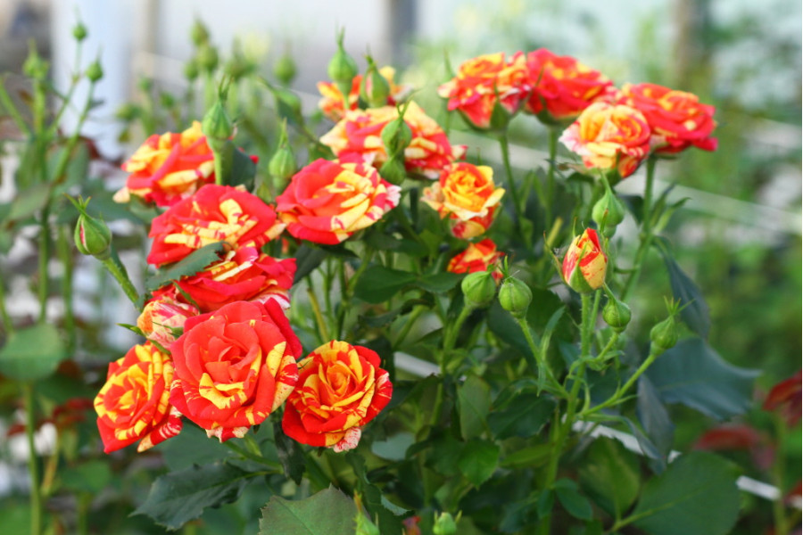 Великолепная бордюрная роза (Файнер Флеш) представляет собой буйство красок и, как будто, передает взрыв невероятных эмоций. Эта роза покорила сердца миллионов россиян своей неповторимой окраской. В одной кисти образуется 5-10 бутонов, распускающихся в цветы клубнично-красного цвета с желтыми полосками и со слегка завернутыми кончиками лепестков. Цветок вырастает до 5-6 см диаметром, а множество лепестков придает цветку объемную форму. Цветет Файнер Флеш весь сезон – с конца мая до поздней осени, непрерывно сменяя одни кисти на другие. Цветение сопровождается тонким приятным фруктово-сладким ароматом.Куст мелкоцветковой розы Файнер Флеш вырастает до 60 см в высоту очень раскидистым и ветвистым, пышность кусту придают темно-зеленые глянцевые листья. Сорт высоко устойчив к поражению грибковыми болезнями, зимостойкий. Цветки розы Fire Flash очень устойчивы к дождю, в любую погоду смотрятся превосходно. Данный сорт прекрасно смотрится в цветниках, клумбах, неплохо выделится в смешанной клумбе. Отлично будет смотреться как отдельно растущий куст на газоне, вдоль дорог и бордюрах.